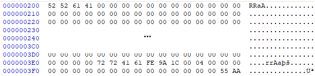 FSINFO 다음으로는 Boot Strap 코드이다. 이 부분은 추가적으로 사용하는 부분인데 거의 비어있다. 섹터의 마지막 부분에 0x55AA 시그니처만 남아있다.