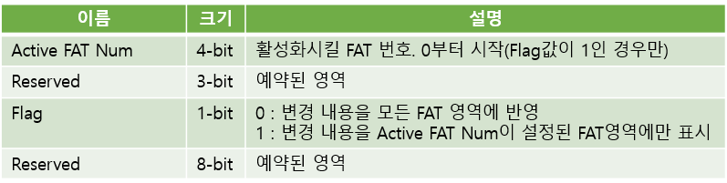 | Ext Flags (하단 Ext Flags 참고) | 여러 개의 FAT 영역을 사용할 경우 설정 값 |