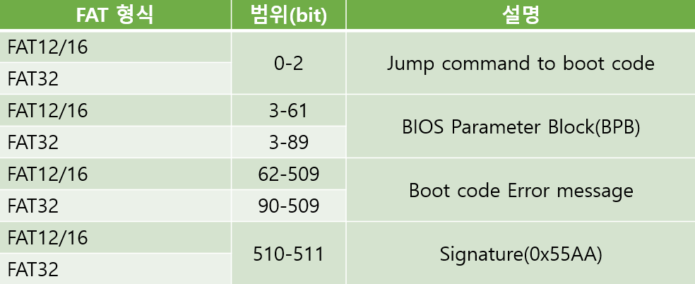 | Boot Signature | 확장 부트 시그니처(보통 0x29)- 확장 부트 시그니처가 존재할 경우,이어서 3개의 부가 정보(볼륨ID, 레이블, 타입)가존재한다는 의미 |