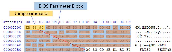 Jump command에서 58의 위치로 가라는 의미이다. FAT12/16은 'EB 3C 90', FAT32는 'EB 58 90' NTFS는 'EB 52 90'값으로 나타난다.