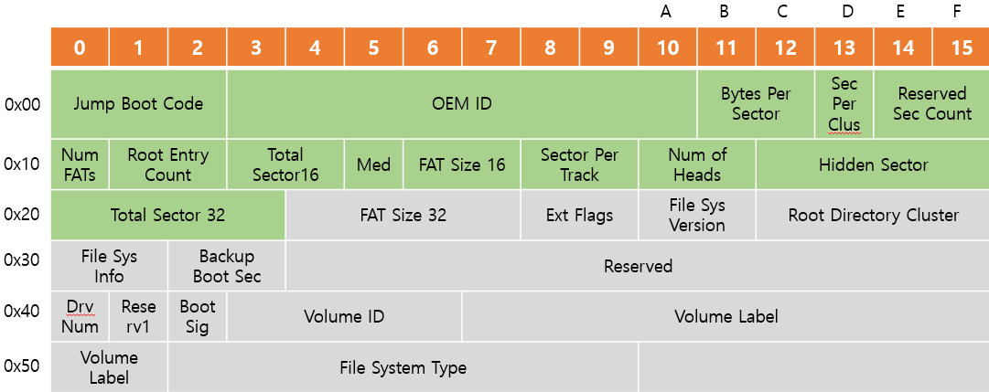 | Total Sector 16 | 파티션 총 섹터 수( 2바이트로 부족할 경우 Total Sector 32 사용 ) |