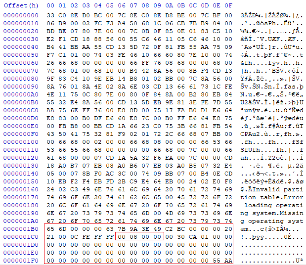 처음 MBR에서 파티션 위치를 확인해준다. 파티션 테이블의 구조는 다음과 같습니다. CHS는 예전 방식이므로, LBA주소를 봐야겠지요? 0x00000800 = 2048이므로 2048섹터로 이동해 줍시다.