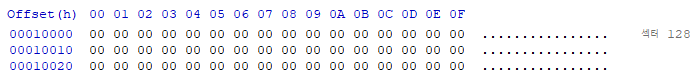 하지만 128섹터에는 아무내용도 적혀있지 않습니다. 원래는 MSDOS5.0이라도 적혀있어야 하는데 말이죠. 하지만 걱정없습니다. 저희에겐 백업영역이 있습니다. 128+6 으로 이동해봅시다. 왜 +6인지 모르면 1편부터 다시보고 오세요!