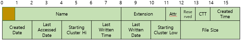 더불어 한 가지 더 알아야 하는 것은, 파일이랑 디렉토리는 저장방식이 다릅니다. 파일은 클러스터에 직접적으로 기록이 되지만, 디렉토리는 디렉토리 엔트리(Directory Entry)라는 구조체 형식으로 저장이 됩니다. 그 구조는 아래와 같습니다.