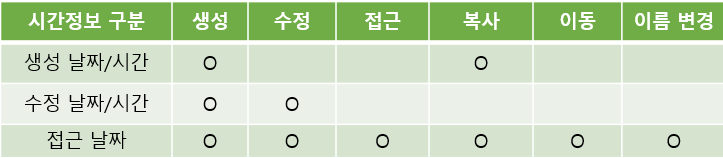 접근 시간은 거의 갱신이 안됩니다. 갱신할 때마다 파일시스템을 변경하는 빈도가 너무 많아서 퍼포먼스가 떨어지게 됩니다. NTFS부터는 사용이 안됩니다. 다음으로는 사용자 행위에 따른 파일 시스템 시간 변경입니다.