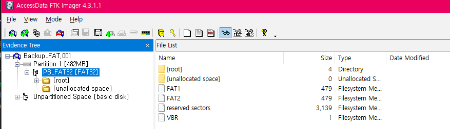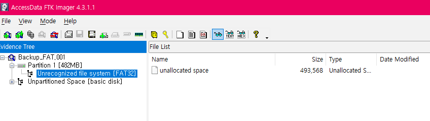 부트섹터와 +6 위치에 백업부분이 있다고 했습니다. FTK이미저로 손상된 FAT32를 열어보았습니다. 정상적으로 사이즈는 인식하나 내용물은 확인이 어렵습니다.